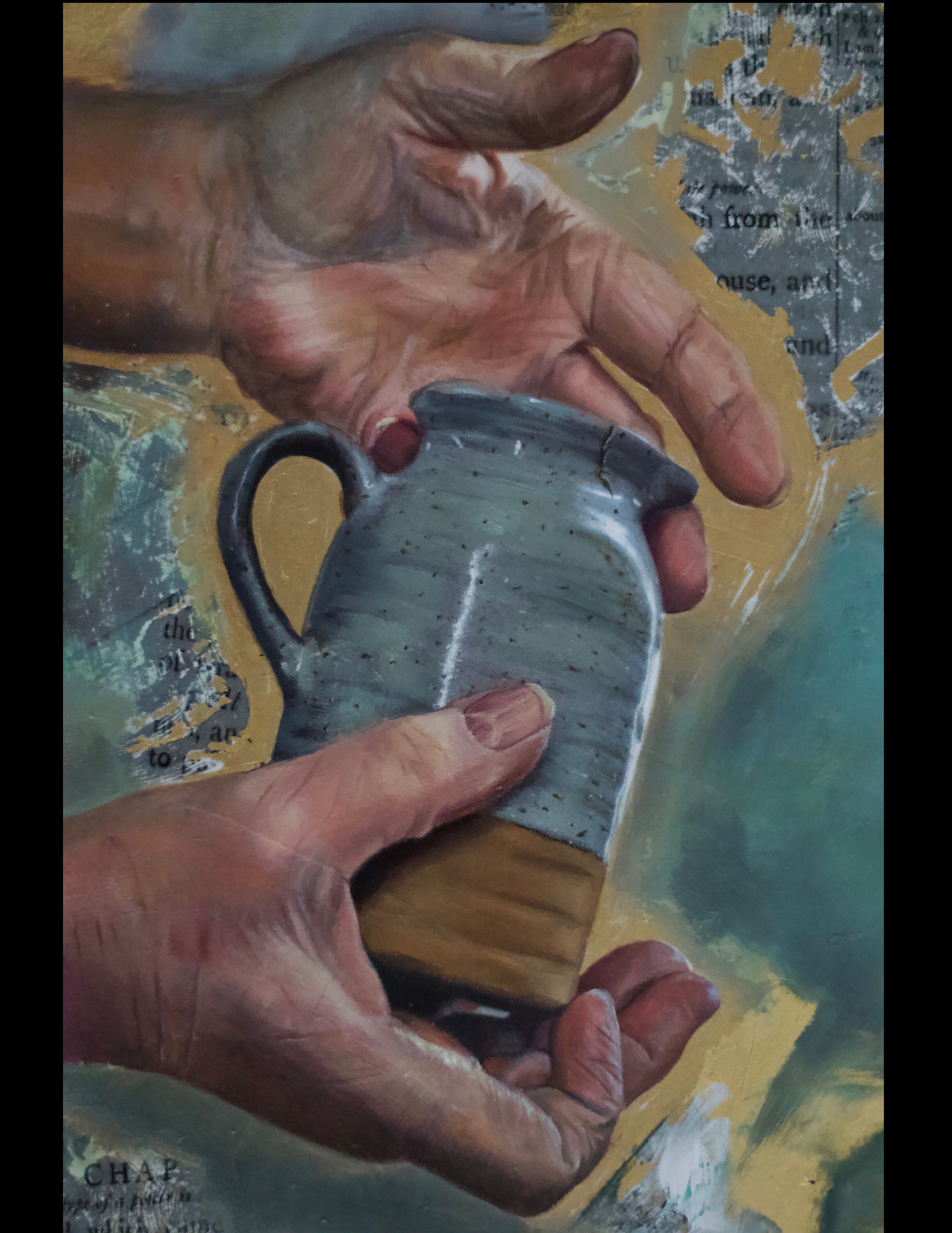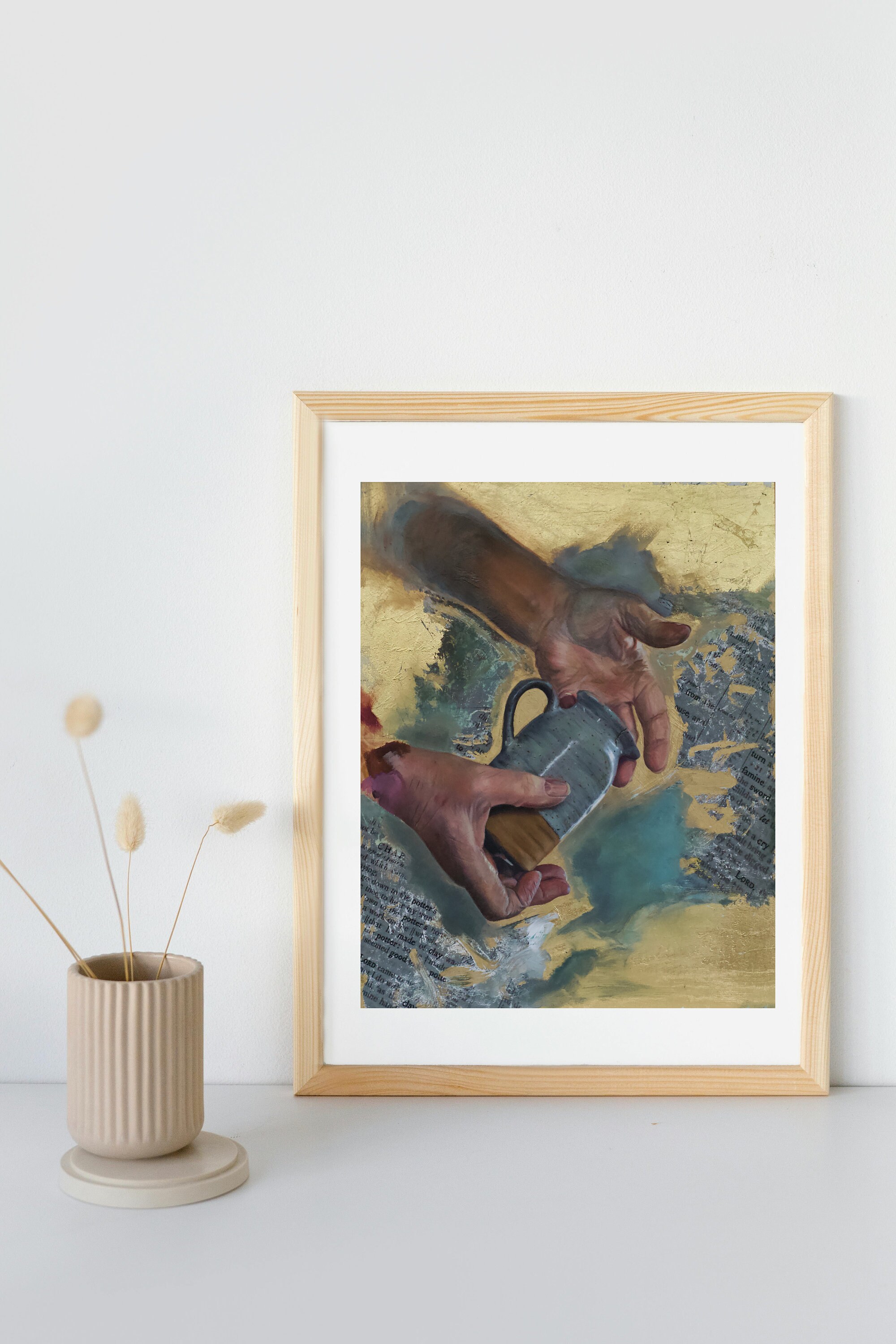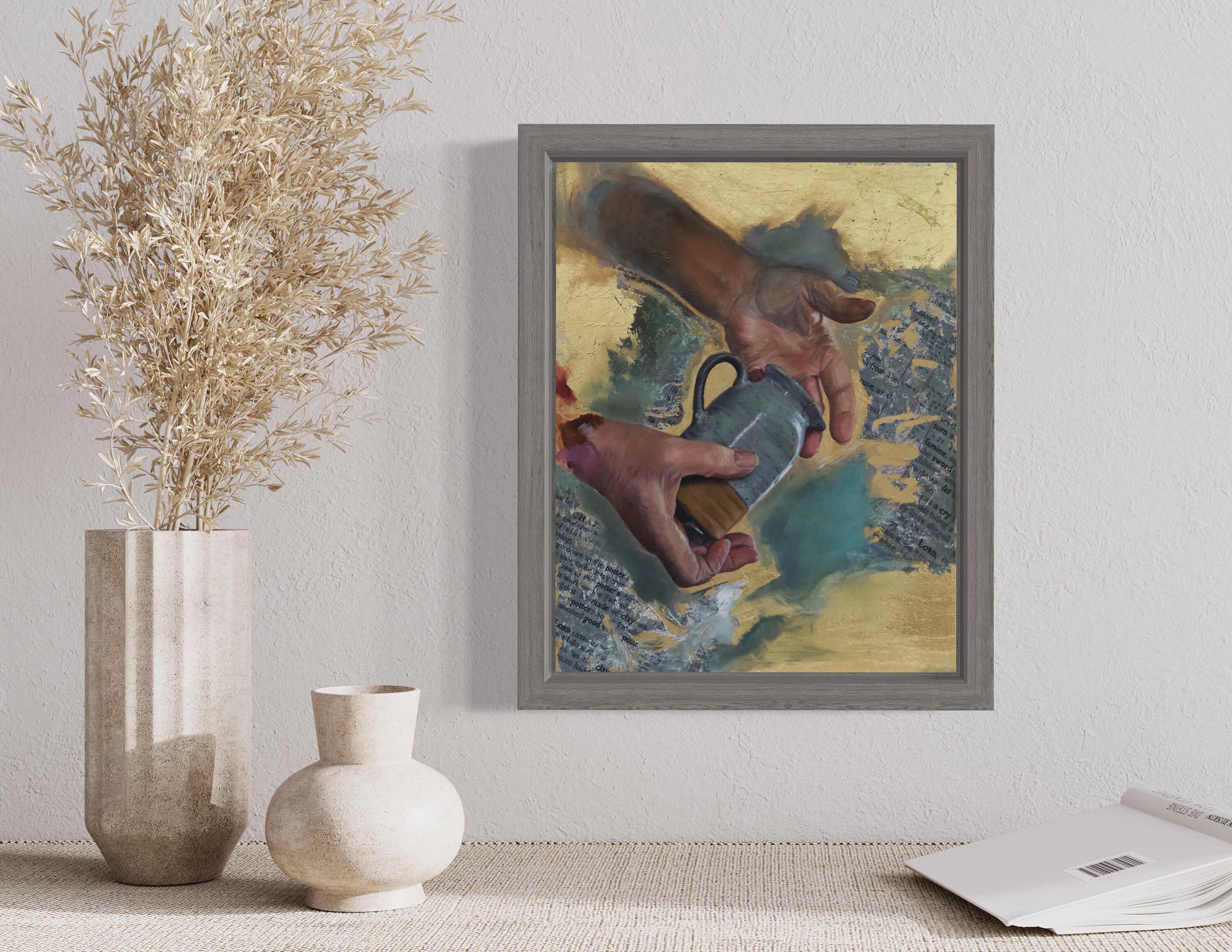 This print is of an original oil and gold leaf painting of the Potter's hands from scripture.