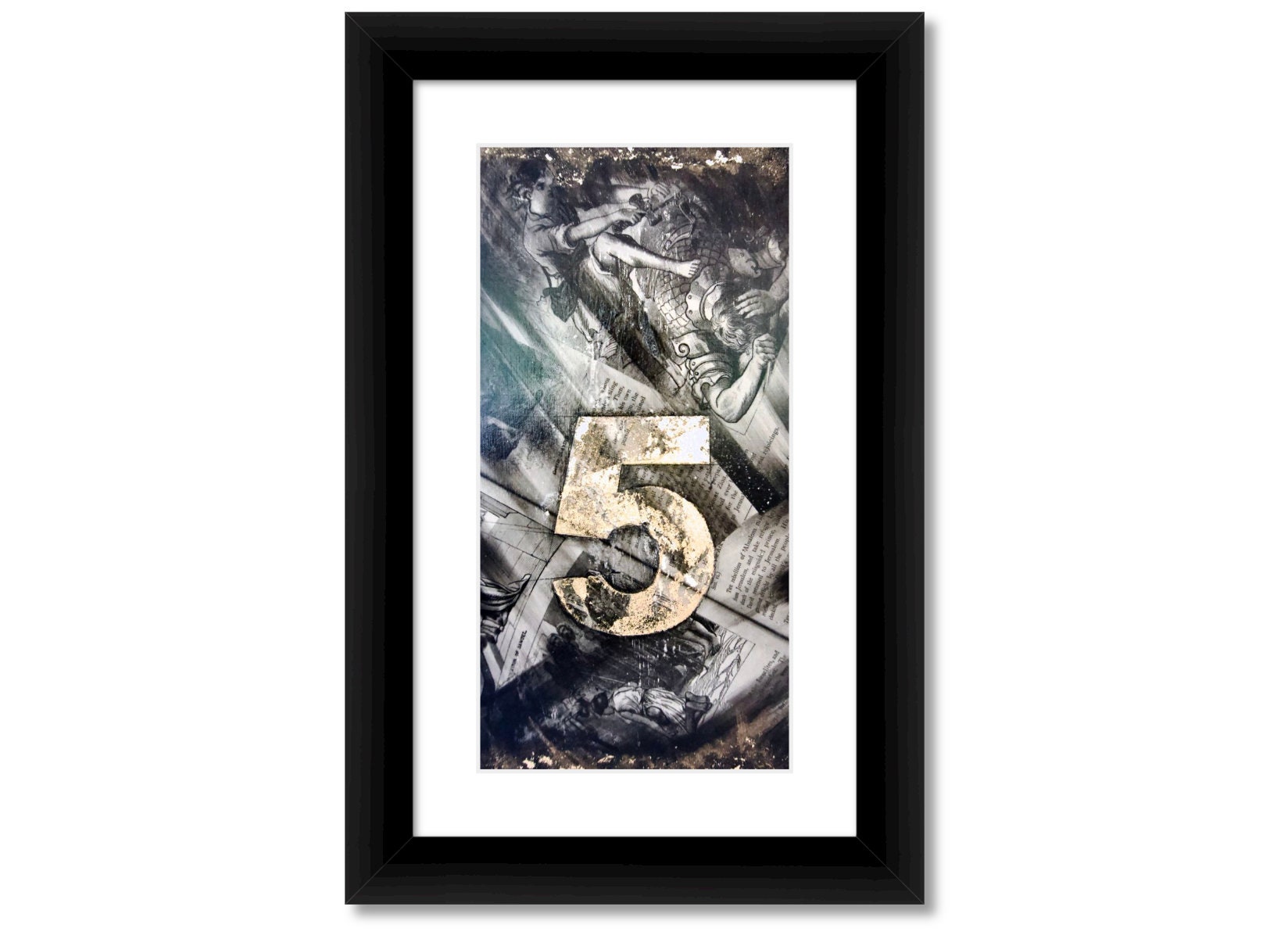 A fine art print on archival paper (or as a lustre print) of an original painting with metallic gold-leaf details and a traditional, illustrative style. The "5" represents the five stones used by David in the Biblical story of David and Goliath.