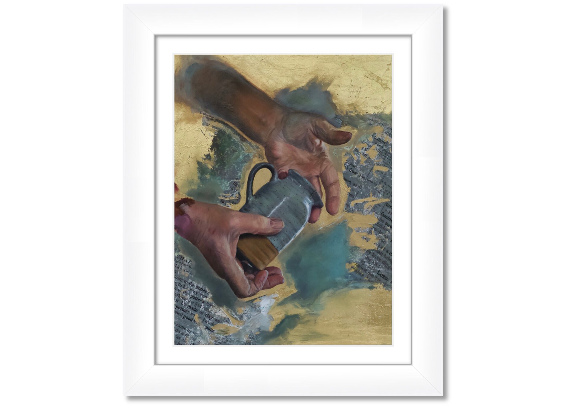 This print is of an original oil and gold leaf painting of the Potter's hands from scripture.