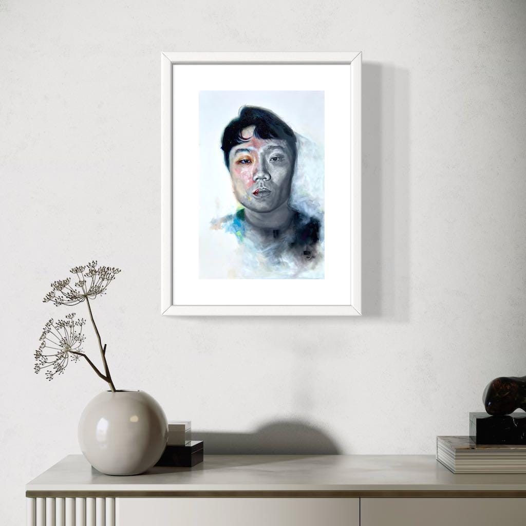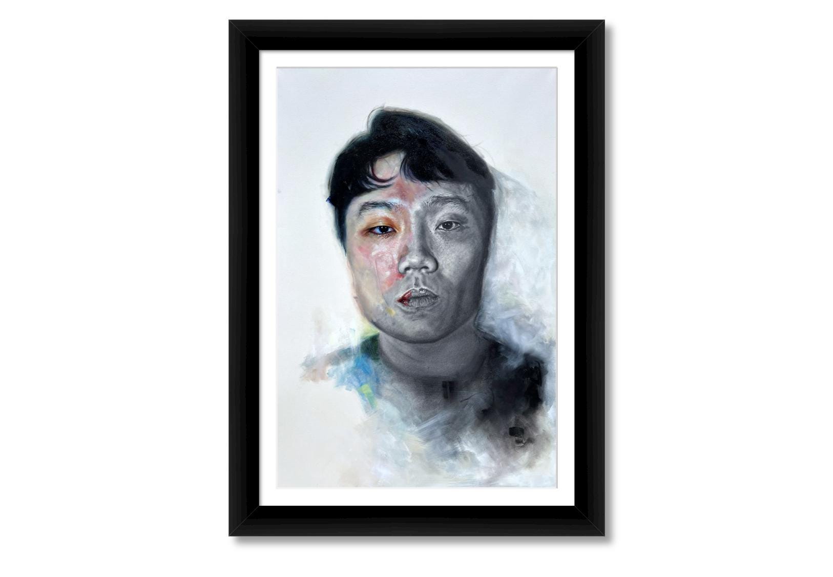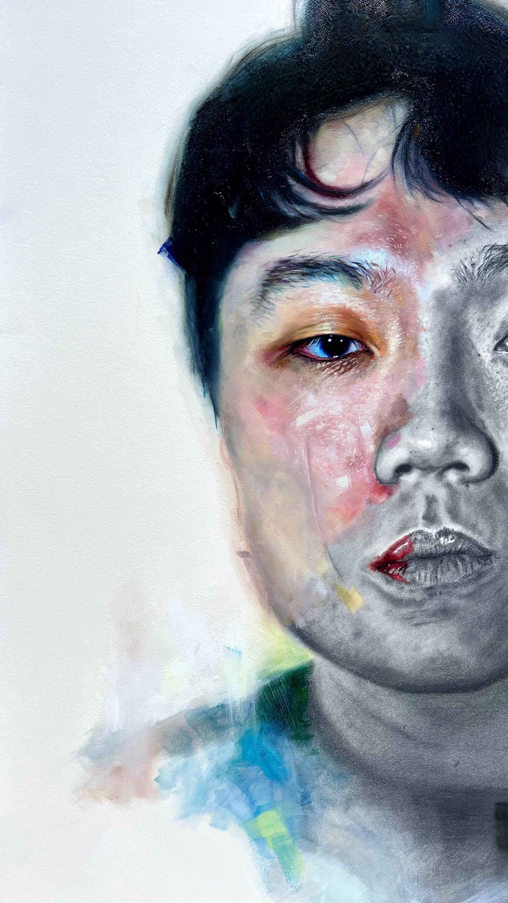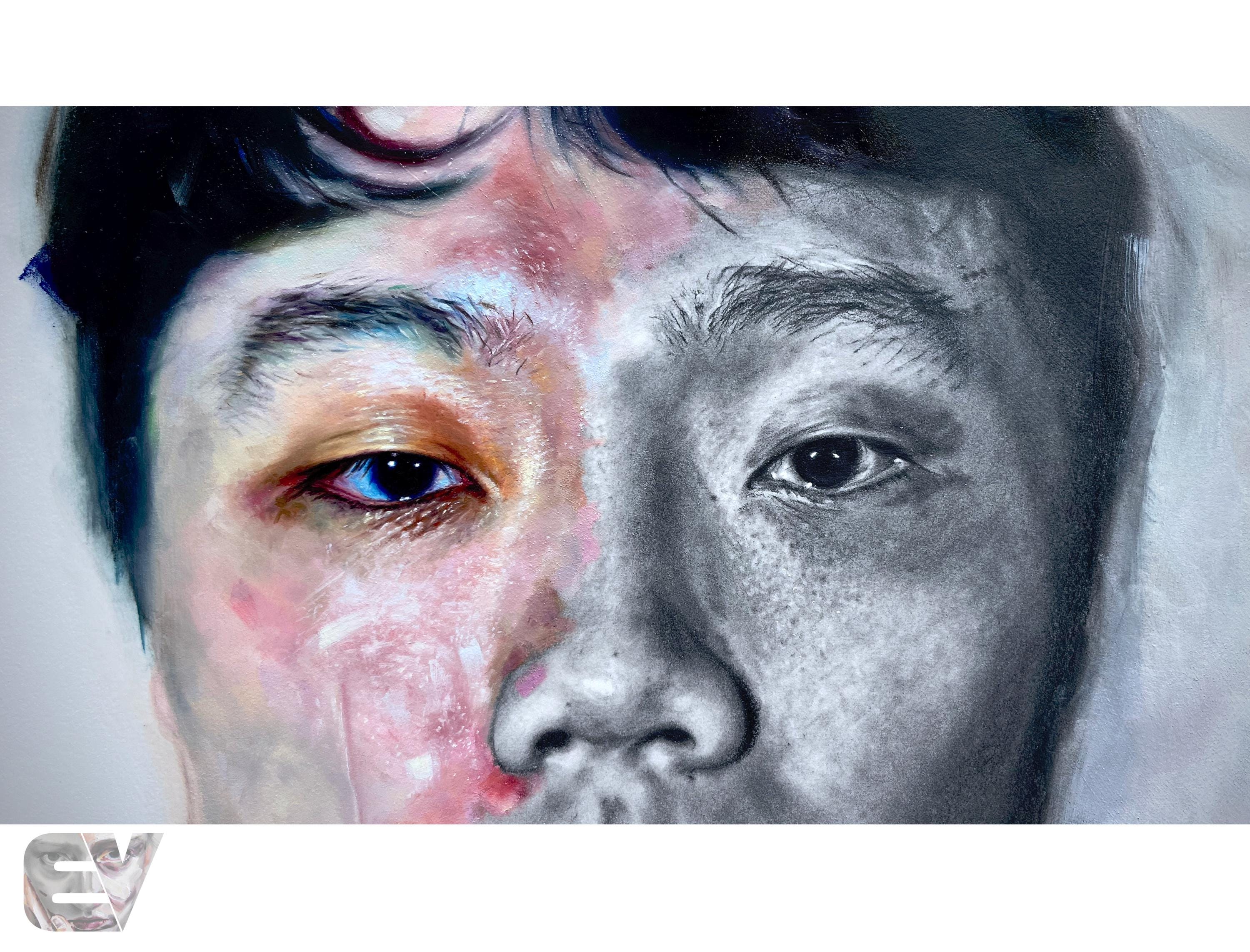 This is a print of a piece is was a mixed media work composed of graphite pencils on the right and oil paint on the left. The amalgam of both mediums represents the transformation from dark to light, from being a child of darkness to a child of the Light. The palette for the painted side utilizes saturated hues to mimic the distinct and isolated colors of a prism.