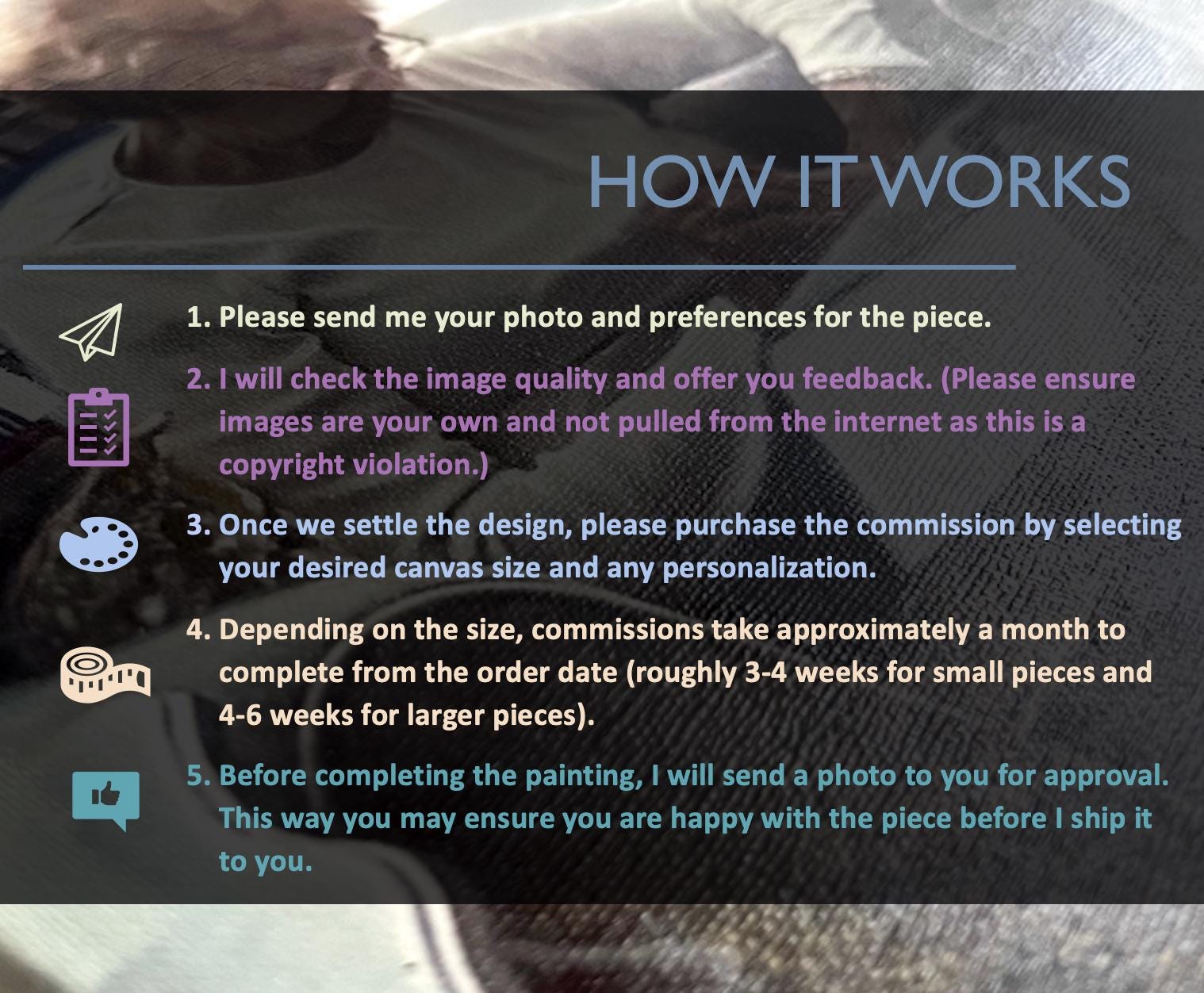 To fulfil your order, you must provide me with certain information (which you authorized Etsy to provide to me), such as your name, email address, postal address, payment information, and the details of the product that you’re ordering. You may also choose to provide me with additional personal information (for a custom-ordered painting, for example), if you contact me directly.