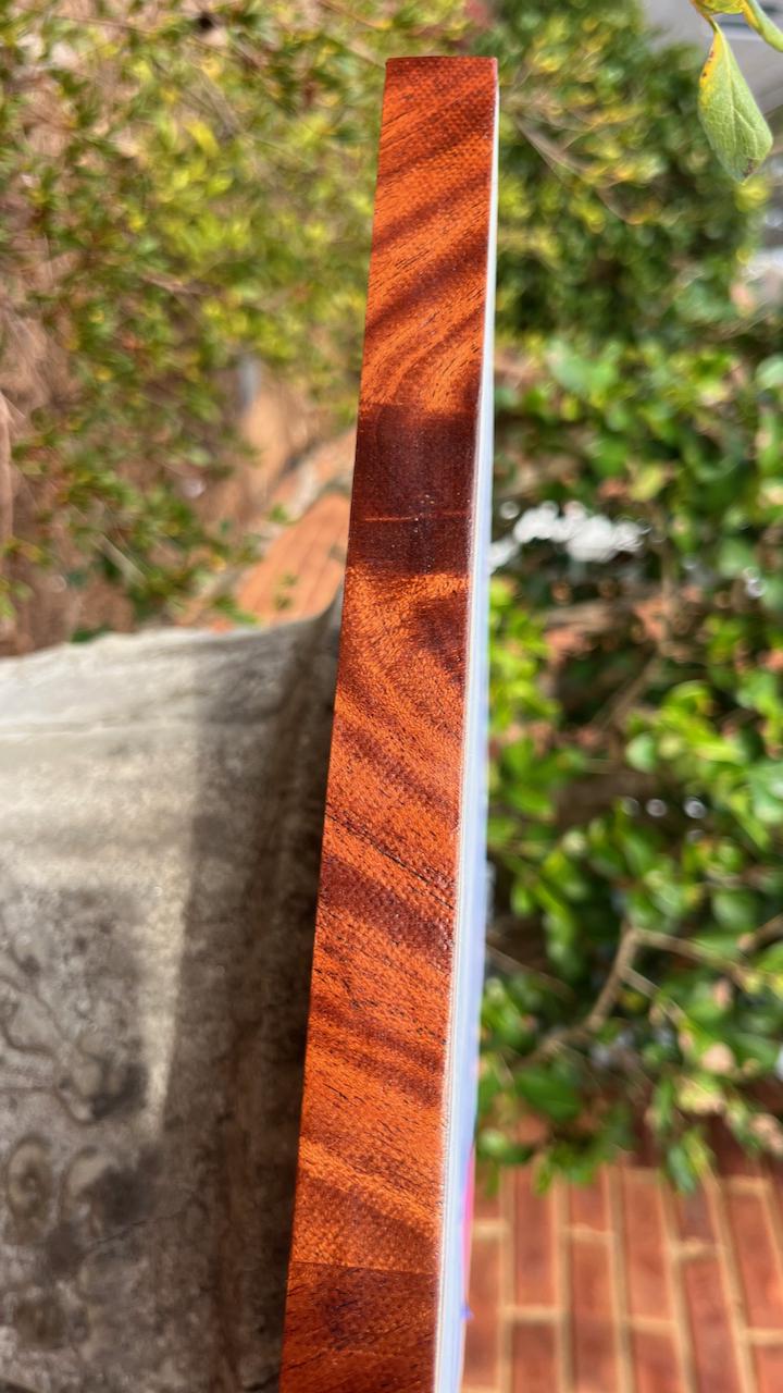 This piece is composed on stretched canvas paper over a birch panel edged with reclaimed mahogany, feather-cut veneer.