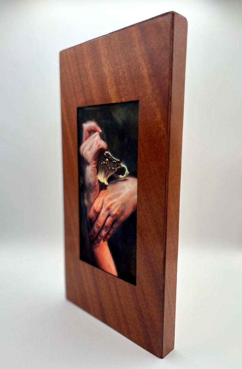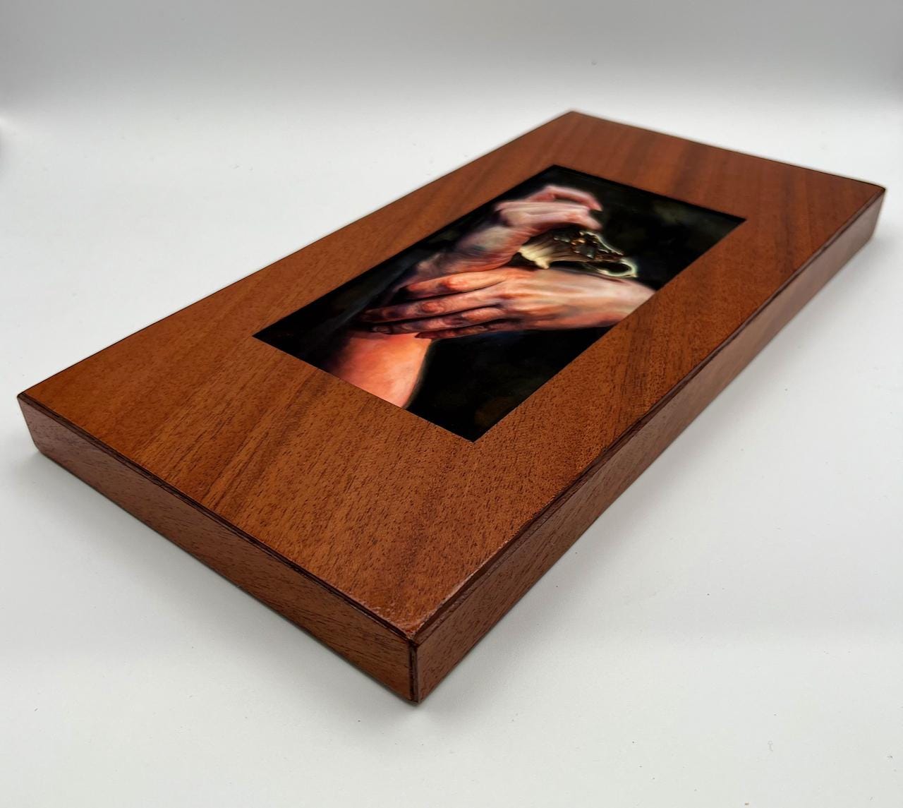 The print of this original oil painting is framed on a birch 6" by 12" panel with mahogany veneer. The frame is carefully finished to highlight the character of the wood, with clean edges and a smooth, satin feel. The artwork is inset into the frame for a dimensional look that elevates it beyond a standard print.